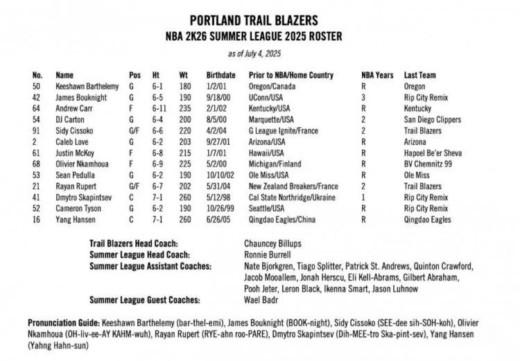 7月5日讯 开拓者官方公布了夏季联赛大名单,中国球员杨瀚森领衔。
