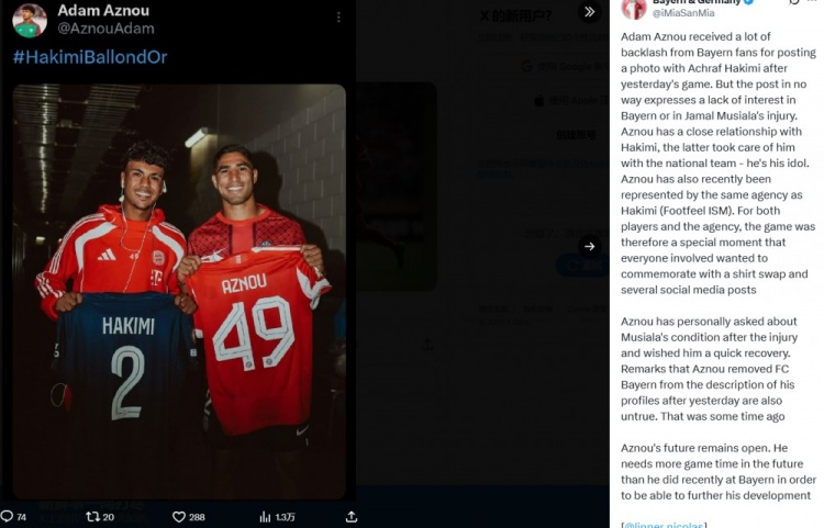 阿兹努在穆西亚拉受伤后亲自询问了他的情况,并祝愿他早日康复。关于阿兹努在昨天的比赛后删除了个人资料中对拜仁的描述的说法也是不实的,那是在之前就已经发生的事情。阿兹努的未来仍然不确定,为了职业生涯的进一步发展,他需要比在拜仁时获得更多的出场时间。