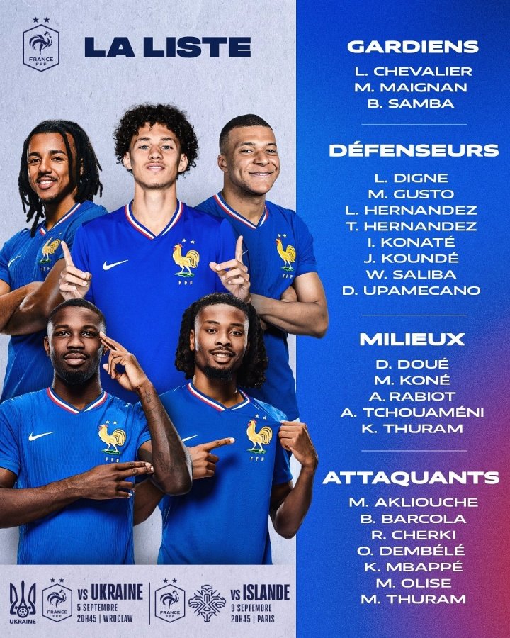 法国国家队将在9月的世欧预中对阵乌克兰和冰岛,小组第一名将直接晋级2026年世界杯。
