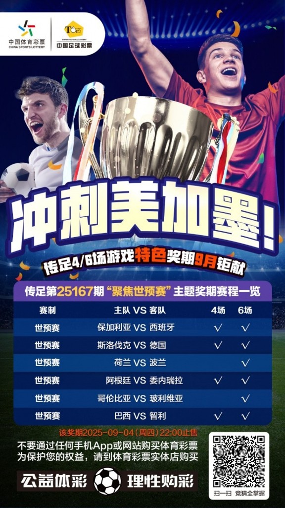 第25167期传足4/6场游戏特色奖期已经于2025年8月31日20:00开售,将于2025年9月4日22:00停售,并于9月5日开奖,其中保加利亚VS西班牙、斯洛伐克VS德国、阿根廷VS委内瑞拉和巴西VS智利为4场进球游戏竞猜赛事。