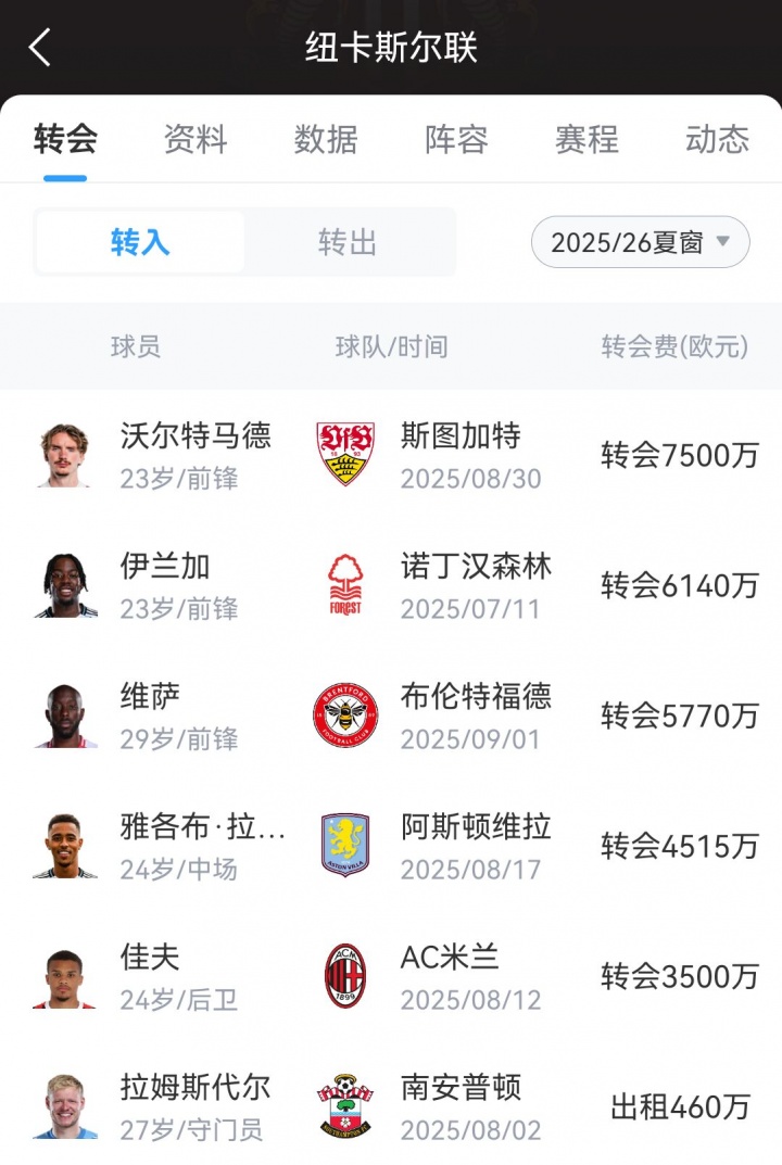 几周前结束的夏窗,纽卡接连错过多个引援目标,最终还是花费约欧元引进了沃尔特马德、伊兰加、维萨等新援。