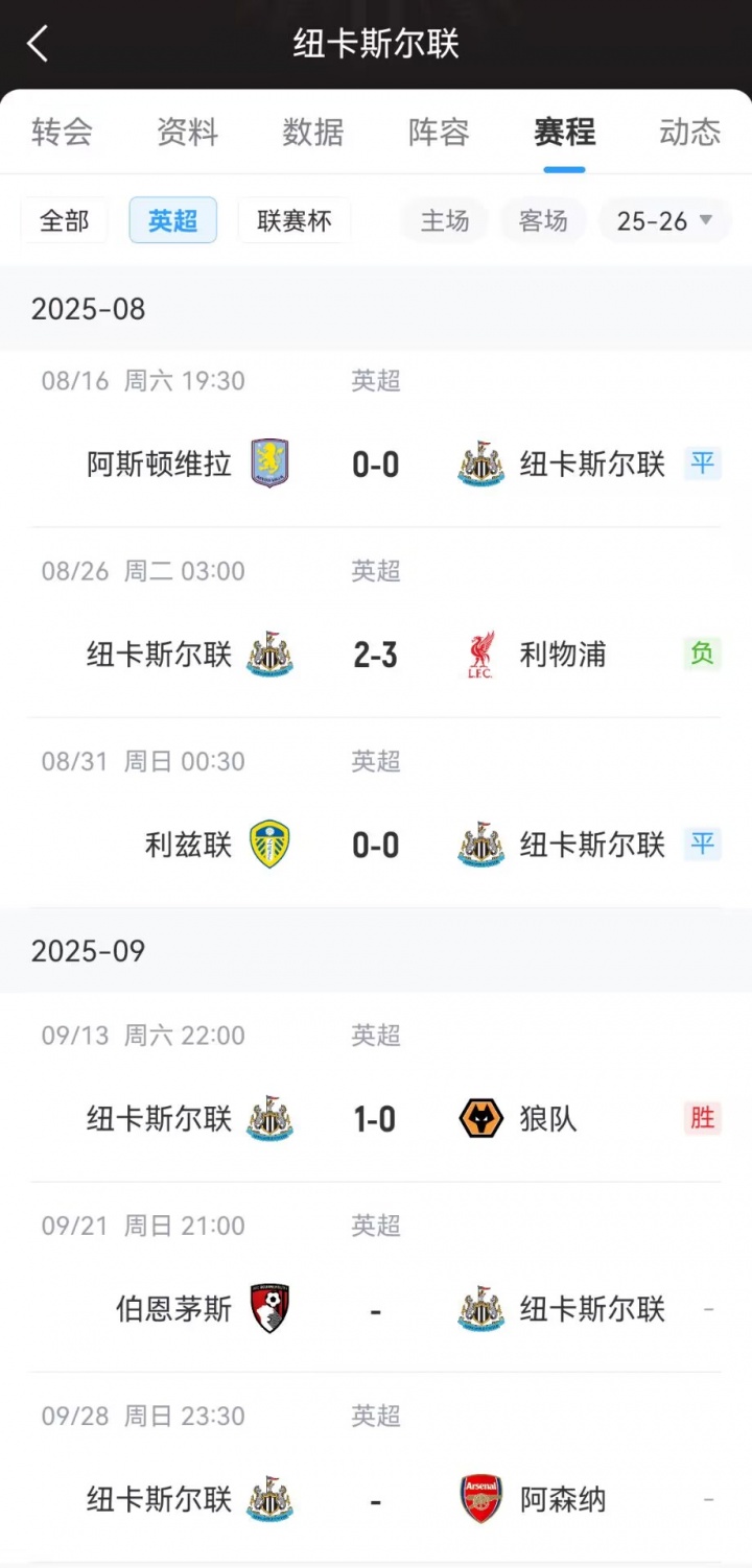 09月21日讯 英超第5轮,纽卡客场与伯恩茅斯0-0闷平。