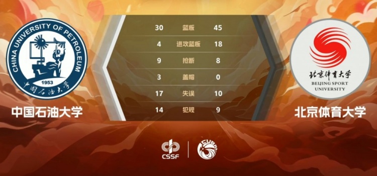 中国石油大学:宋烽岩16分4板3助、张思雨12分5板、武涛12分、刘恒康8分、郜周旭5分、于昆宏5分3板、孔玺铭3分6板