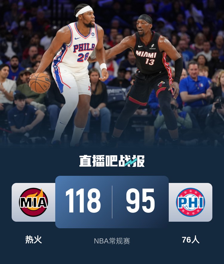 上半场,双方开场势均力敌,比分交替领先,巴特勒高效发挥,热火多点开花给出回应,次节双方继续缠斗,热火稳扎稳打逐渐占据场上主动,希罗手感火热,帮助热火半场62-53领先76人。下半场,热火延续手感,连中三分一举将分差拉开到20分以上,末节希罗三分2连击继续扩大领先,76人奋力反击,但热火稳扎稳打将优势保持到最后。最终,热火118-95大胜76人,后者无缘季后赛。