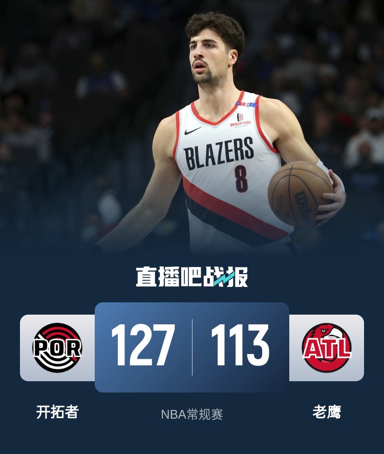 开场后两队就打得十分胶着,场上比分多次打平,开拓者一度靠冲击内线取得领先,第一节尾声老鹰连续断球反击将比分反超。第二节上来老鹰率先打出8-0攻势,开拓者通过加强防守回敬一波10-0的攻势,奥孔武和丹尼尔斯轮番冲击内线完成终结,开拓者外线手感不错保持领先优势。易边再战,夏普和阿夫迪亚联手带领开拓者打出攻势,虽然特雷-杨带领老鹰紧追不舍,但开拓者状态火热单节轰下40分将分差拉大到两位数。最后一节老鹰上来继续发动反扑追到只差5分,但开拓者及时稳住阵脚再度将比分拉开,最终开拓者127-113击败老鹰结束4连败。
