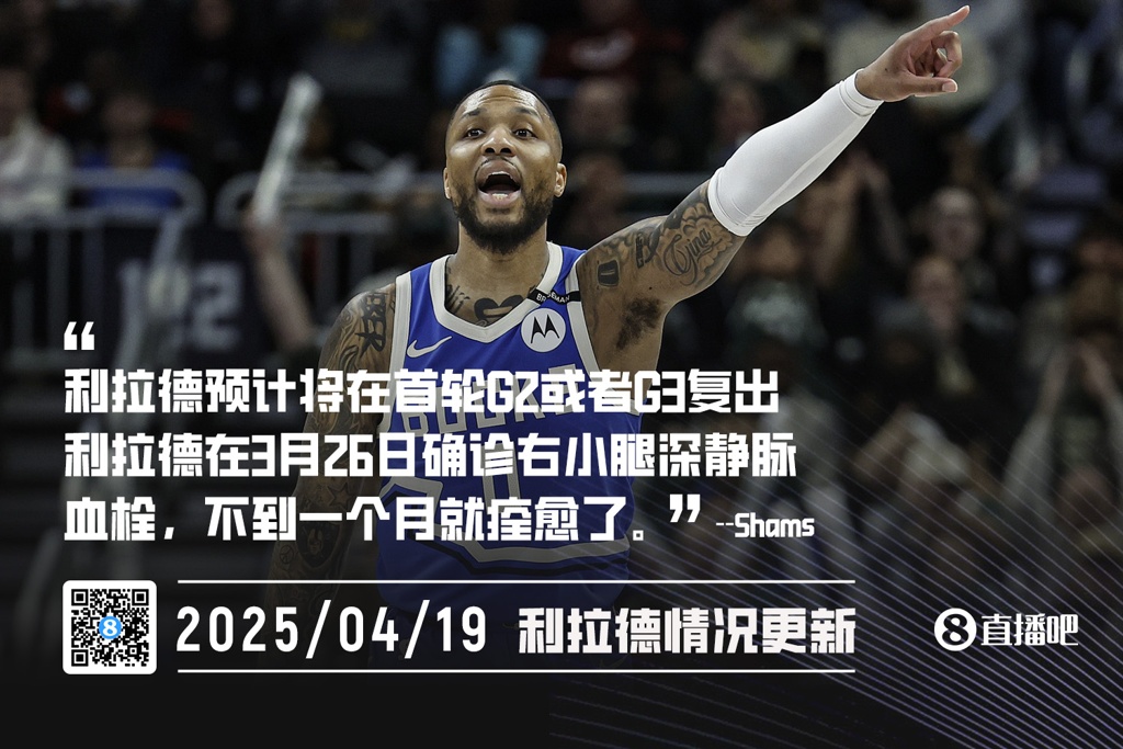 深静脉血栓不到一个月痊愈⏲️Shams:利拉德预计首轮G2或G3复出