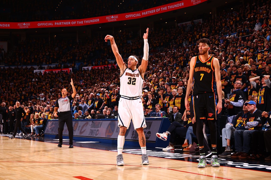 今年西部半决赛G1,主角换成阿隆-戈登,他全场轰下22分、14个篮板,两项数据在掘金队内仅次于约基奇。第四节最后时刻,戈登接应威少分球命中准绝杀三分,这是他本赛季季后赛第2个制胜球。在雷霆这群有高度没吨位,有臂展没高度的锋线面前,身高2米03、体重107公斤的戈登优势尽显。