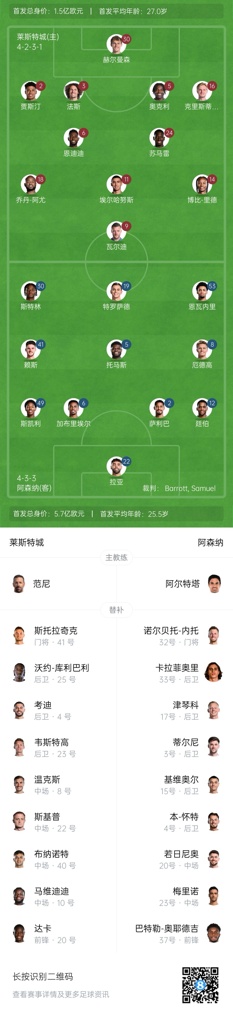 阿森纳客战莱斯特城首发:特罗突前,斯特林先发,本-怀特替补