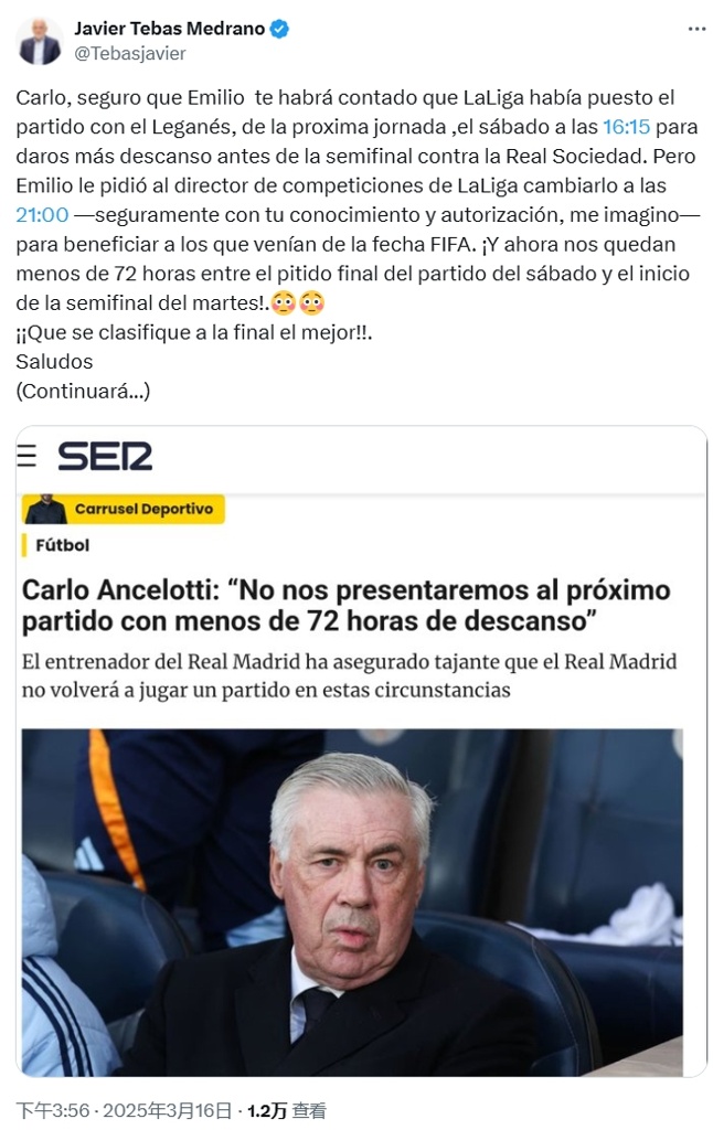“卡洛,想必埃米利奥(皇马高层布特拉格诺)肯定会告诉你,西甲为了让你们有更多休息时间备战皇家社会的半决赛,原本把莱加内斯的比赛安排在周六的16:15。但埃米利奥却请求西甲主管将比赛改期到21:00,想必你对此是知情并且批准的吧?我猜,你们此举是为了让从国际比赛日回归的球员有更多的休息时间,结果现在你看,从周六西甲联赛结束到周二国王杯半决赛开始,你们又只剩下不到72小时的休息时间!