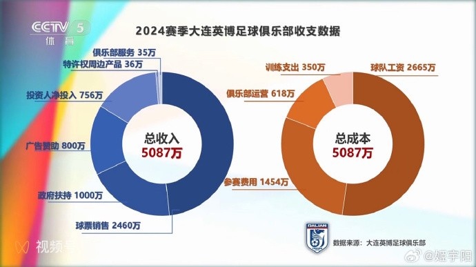 据《足球之夜》栏目披露的数据,大连英博上赛季运营总成本5087万,分别是工资2665万、参赛费用1454万、俱乐部运营618万、训练支出350万。