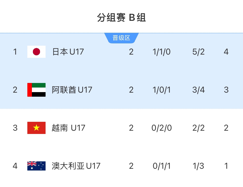 04月11日讯 U17亚洲杯B组末轮战罢,越南1-1阿联酋,日本2-3澳大利亚。日本和阿联酋最终小组出线,但本组的晋级局势比赛中多次反转。