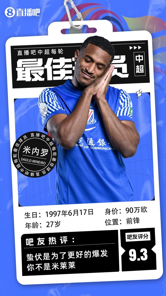 【直播吧】中超第13轮最佳球员:传射助申花稳定榜首!米内罗当选