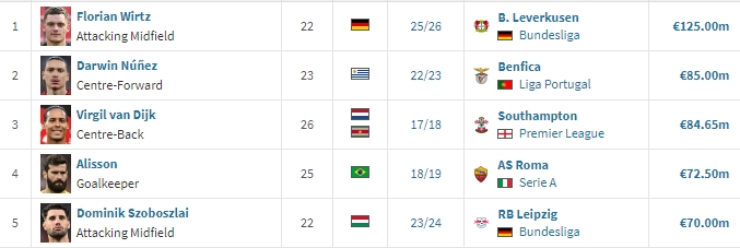 利物浦队史引援记录(德转统计,埃基蒂克未官宣)