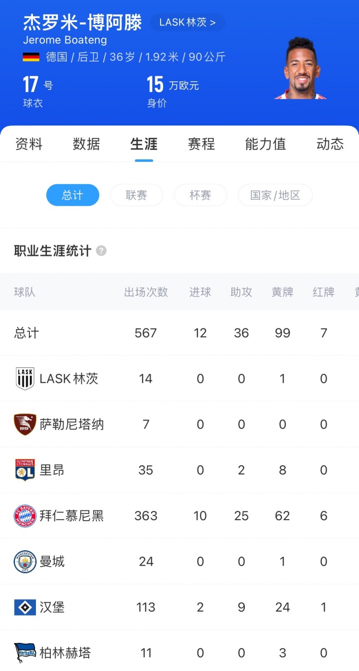 36岁的博阿滕上赛季为林茨出场14次,共计444分钟,他目前的身价为15万欧。