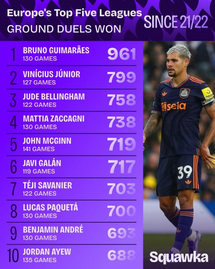 9月11日讯 Squawka统计了2021-2022赛季以来球员在五大联赛地面对抗成功的次数,并列出榜单,吉马良斯961次居首,维尼修斯、贝林厄姆二三位。