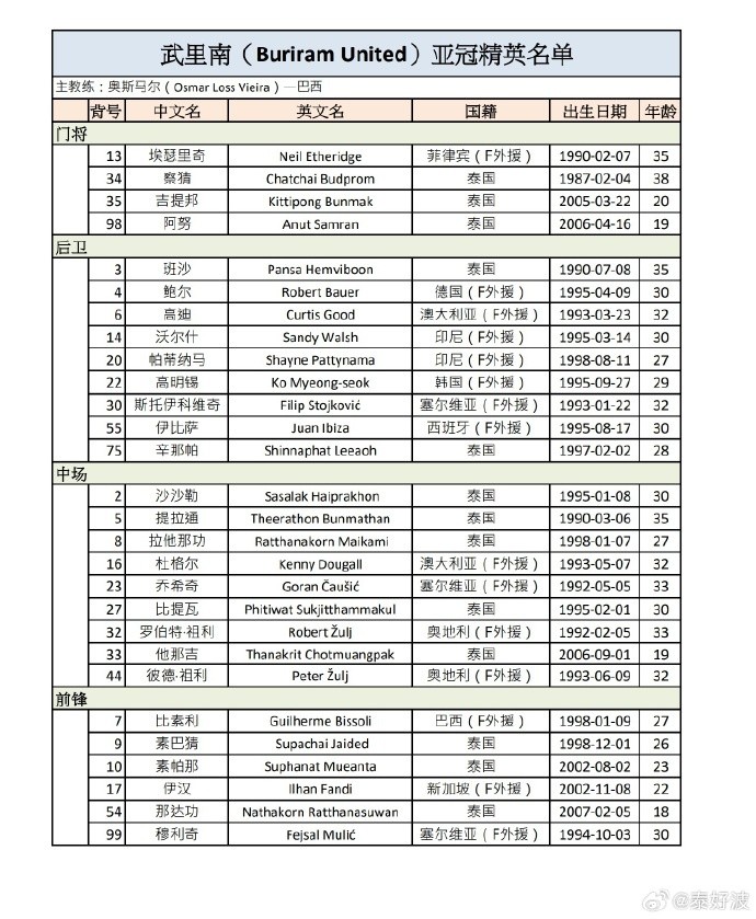 9月15日讯 新赛季亚冠精英联赛即将打响,武里南联公布28人参赛名单,球队共有15位外援,前亚泰球员彼得-祖伊在列。小组赛阶段,武里南联与海港、蓉城、申花三支中超球队都将有交手。