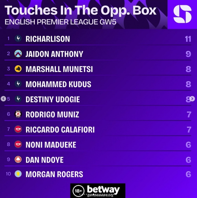 9月24日讯 英超第5轮战罢,squawkafootball列各项数据排行,热刺前锋理查利森是本轮在对方禁区触球最多的球员,共11次。